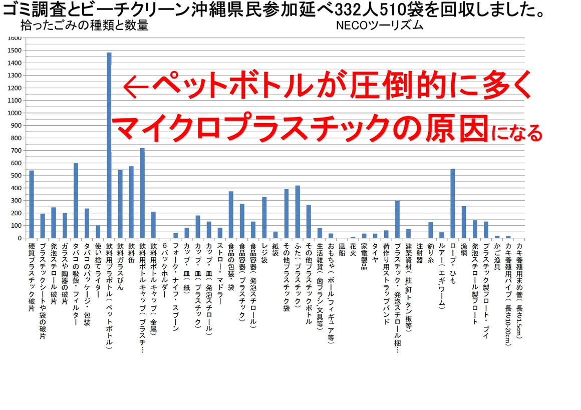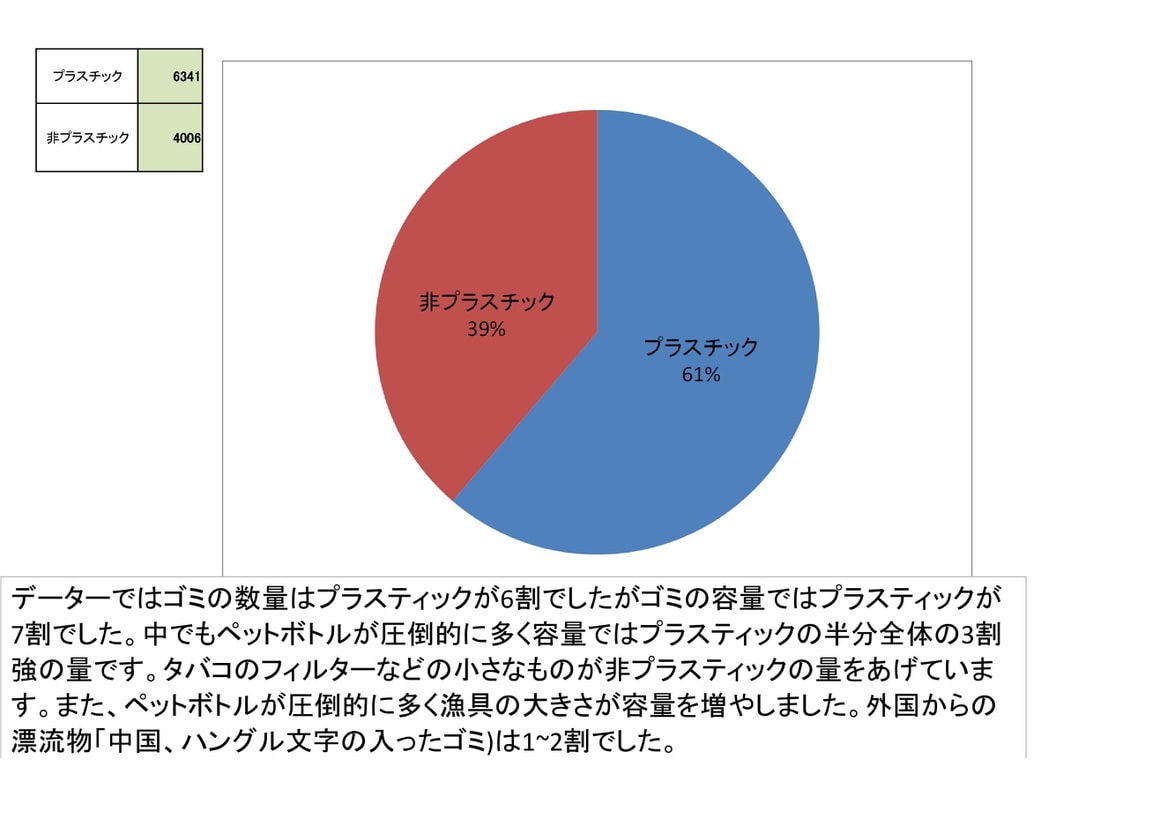 データーではゴミの数量はプラスティックが6割でしたがゴミの容量ではプラスティックが7割でした。中でもペットボトルが圧倒的に多く容量ではプラスティックの半分全体の3割強の量です。タバコのフィルターなどの小さなものが非プラスティックの量をあげています。また、ペットボトルが圧倒的に多く漁具の大きさが容量を増やしました。外国からの漂流物「中国、ハングル文字の入ったゴミ)は1~2割でした。同じ場所を何度も掃除しているが、ポイ捨ての数が減らない。今回はサンゴに影響のあるマイクロプラスチックも参加者に説明し拾っていただきました。色付きはわかるが、透明なものは見分けがつかない。
